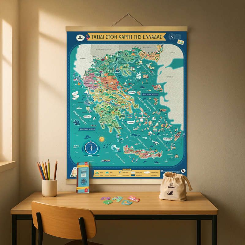 Το Μαγνητικό Παζλ Χάρτης είναι ένα εκπαιδευτικό και διασκεδαστικό παιχνίδι που βοηθάει τα παιδιά να γνωρίσουν τη γεωγραφία της Ελλάδας μέσα από το παιχνίδι. Σχεδιασμένο με εκπαιδευτική ακρίβεια γεμάτο γεωμορφολογικά στοιχεία – βουνά, ποτάμια, λίμνες – και μαγνητάκια που αναδεικνύουν τοπικά προϊόντα, αξιοθέατα και έθιμα, συμβάλλει στο να γνωρίσουν τη γεωγραφία και τη πολιτιστική κληρονομιά της χώρας μας.. Το Μαγνητικό Παζλ διαθέτει πυξίδα, υπόμνημα και γραφική κλίμακα για εύκολο προσανατολισμό, ώστε να κατανοούνε τα παιδιά τις αποστάσεις και τις τοποθεσίες. Επιπλέον, το παιχνίδι γίνεται πιο συναρπαστικό καθώς καλούνται να ανακαλύψουν 15 κρυμμένες γάτες στις εικόνες του. Ένα παιχνίδι γεμάτο γνώσεις, περιπέτεια και διασκέδαση για μικρούς και μεγάλους.